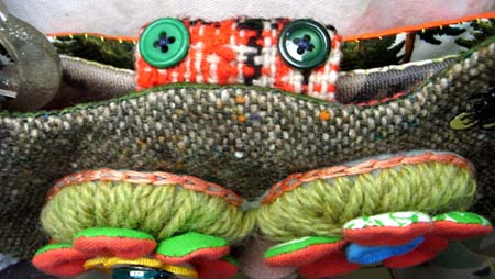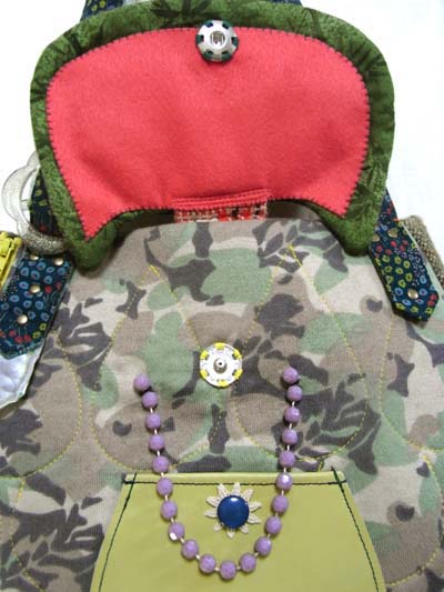 | 作品番号:im_bag17 作品名:ふくろうbag:実はアクティブオリーブちゃん サイズ: 本体約33cm×23cmマチ含まず) マチ約10〜4.5cm もち手の長さ:約50cm 外、革ポケット:14cm×11.5cm 内ポケット(小)12cm×9cm 素材:コットンニット・ウール・フェルト・革・毛色・プリントコットン・プラスチックボタン、バックル ほか |