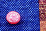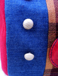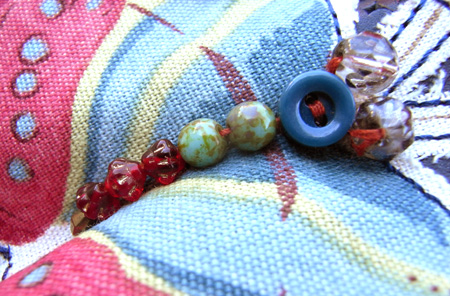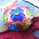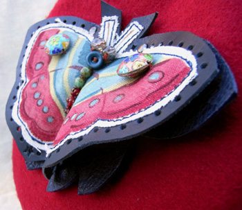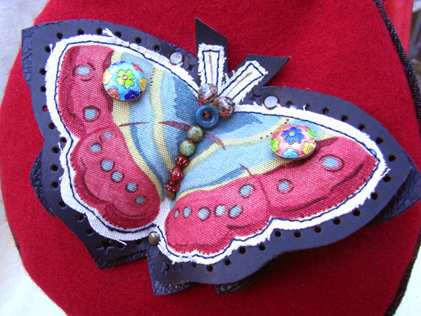 イギリスのファブリック生地、レザー、七宝ビーズ、ビンテージボタン等で飾った