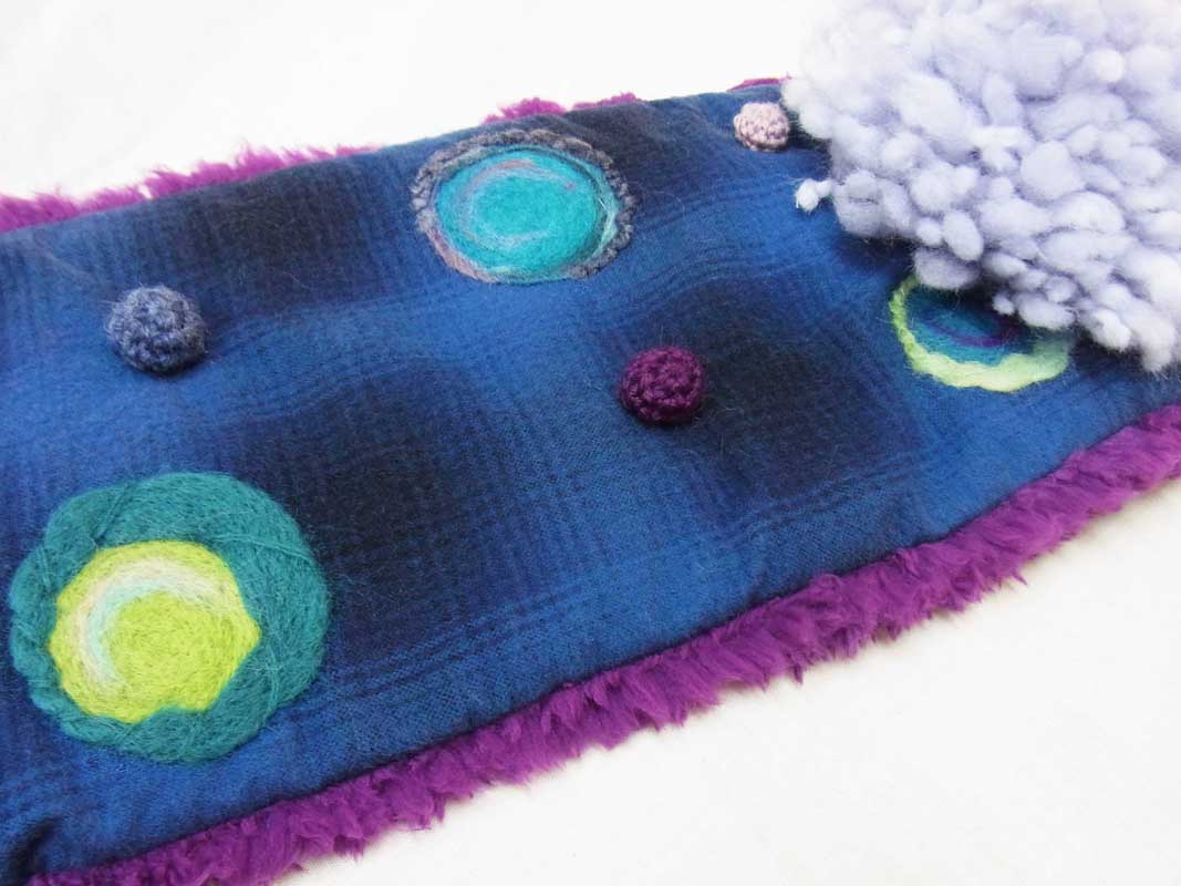 チェックの布地の上に、編み玉と、原毛、毛糸をニードル針でぷすぷすと、刺し付けていくフェルトワークで楽しく飾りました